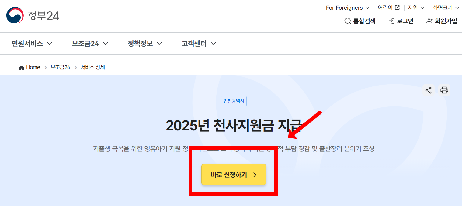 - 정부24 또는 복지로 → 로그인 → “천사지원금” 검색 → 출생아 정보 입력 → 신청 완료